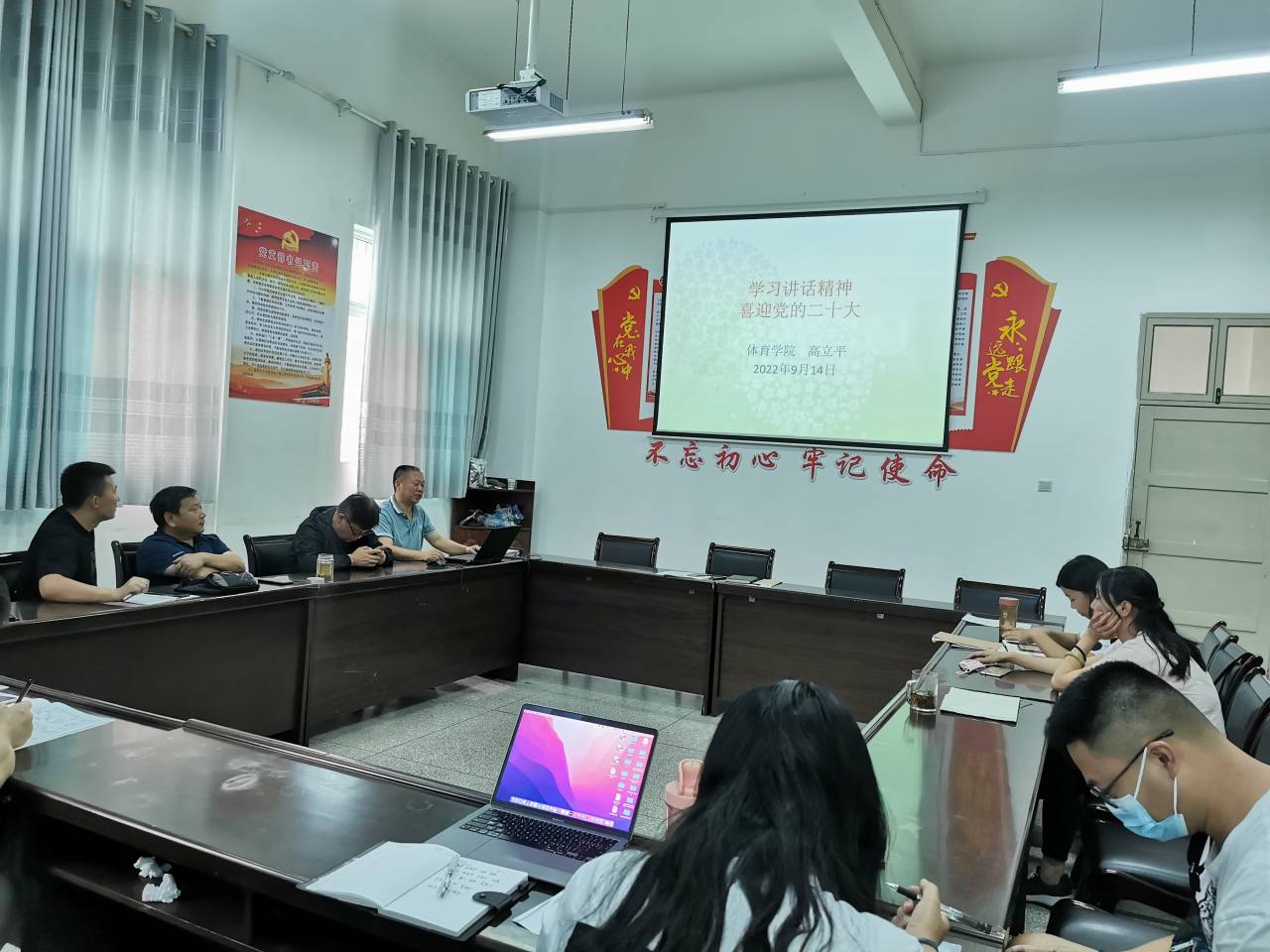 9月14日下午,澳门正规电子游戏平台党总支书记高立平以“学习讲话精神,喜迎党的二十大”为题,为我院全体党员上专题党课。全体党员参加会议。