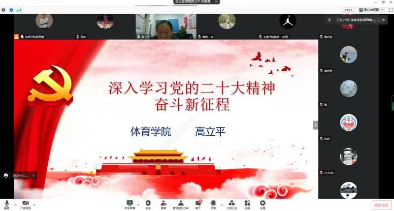 本次工会活动运用“腾讯会议”软件以线上形式开展,邀请澳门正规电子游戏平台党总支书记高立平同志为澳门正规电子游戏平台全体教师作了题为《深入学习党的二十大精神—奋斗新征程》的主题报告,从党的二十大召开概况;党的二十大的主要精神和如何贯彻党的二十大精神等三个方面进行了宣讲。