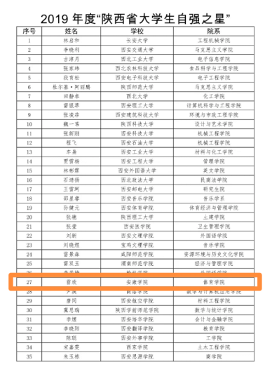 根据共青团陕西省委《关于组织开展寻访2019年度“陕西省大学生自强之星”活动的通知》文件精神,2019年度“陕西省大学生自强之星”活动结果已揭晓。安康学院共有两名同学成功入选。其中,我院2017级优秀学子雷欣荣获2019年度“陕西省大学生自强之星”荣誉称号。