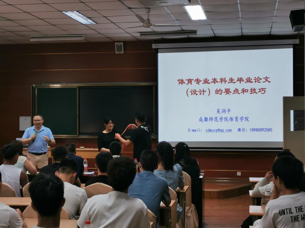 为提高我院学生毕业论文撰写技能,6月11日下午14:30,成都师范学院澳门正规电子游戏平台院长吴润平教授来我院做了以“体育专业大学生毕业论文(设计)的要点和技巧”为主题的学术讲座,澳门正规电子游戏平台全体18级、19级学生参加了本次报告会,报告会由学院党总支书记高立平主持。