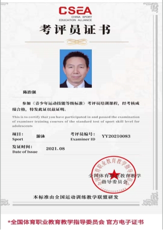 游泳是一项老少皆宜并深受人们喜爱的运动项目,它能够全面提高身体各系统的机能,改善体质水平,增进身心健康。同时,游泳也是一项重要的生存机能。为了促进安康游泳运动项目的发展,我院陈治强老师积极利用暑假时间,通过体教联盟平台进行线上学习,经过理论和实操两个环节的全面考核,获得了游泳项目考评员证书。游泳考评员资格的取得可以按照《青少年游泳运动技能等级标准》要求从事游泳项目考核相关工作,使考生能够在本地参与考核获取体教联盟认证的游泳项目等级证书,这对促进游泳项目的开展和学生学习的积极性具有重要意义。