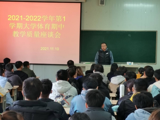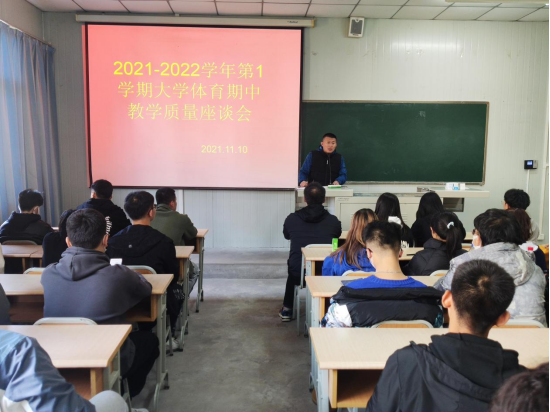 为了切实做好《大学体育》课程的教学工作,了解教学现状,科学安排教学内容,提高教学质量,促进大学体育教学改革,2021年11月10日下午2点30分,澳门正规电子游戏平台在江南校区1028教室召开了2021—2022学年第一学期大学体育期中教学工作座谈会。澳门正规电子游戏平台副院长郭西魁、大学体育教研室主任李强以及各二级学院体育部干事、2020级和2021级各班班长、体育委员参加了本次座谈会。会议由李强老师主持。