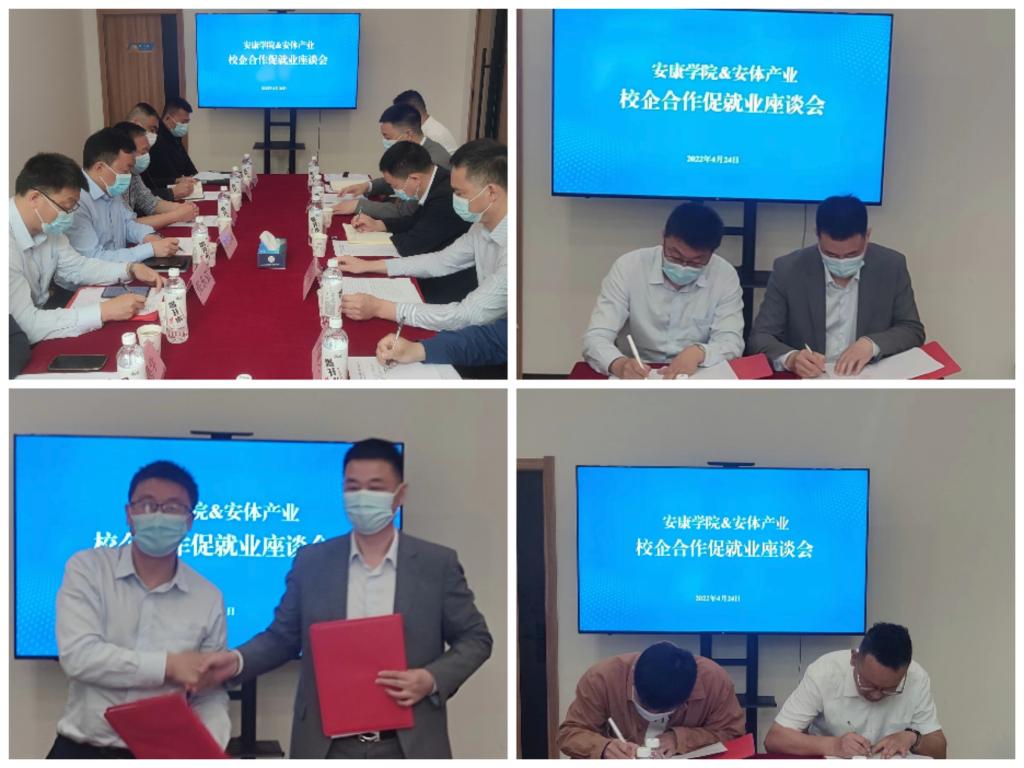 座谈会上,李聪致欢迎词并详细介绍了企业发展情况;张东红介绍了安康学院办学理念、教科研及人才培养情况;安体产业公司运营总监金沙介绍了企业人才需求情况;安康学院在安体产业公司实习生代表姜澳做了交流发言;张东红和李聪分别代表学校和安体产业公司签订了校企合作协议;金沙与姜澳也现场签订了就业协议。