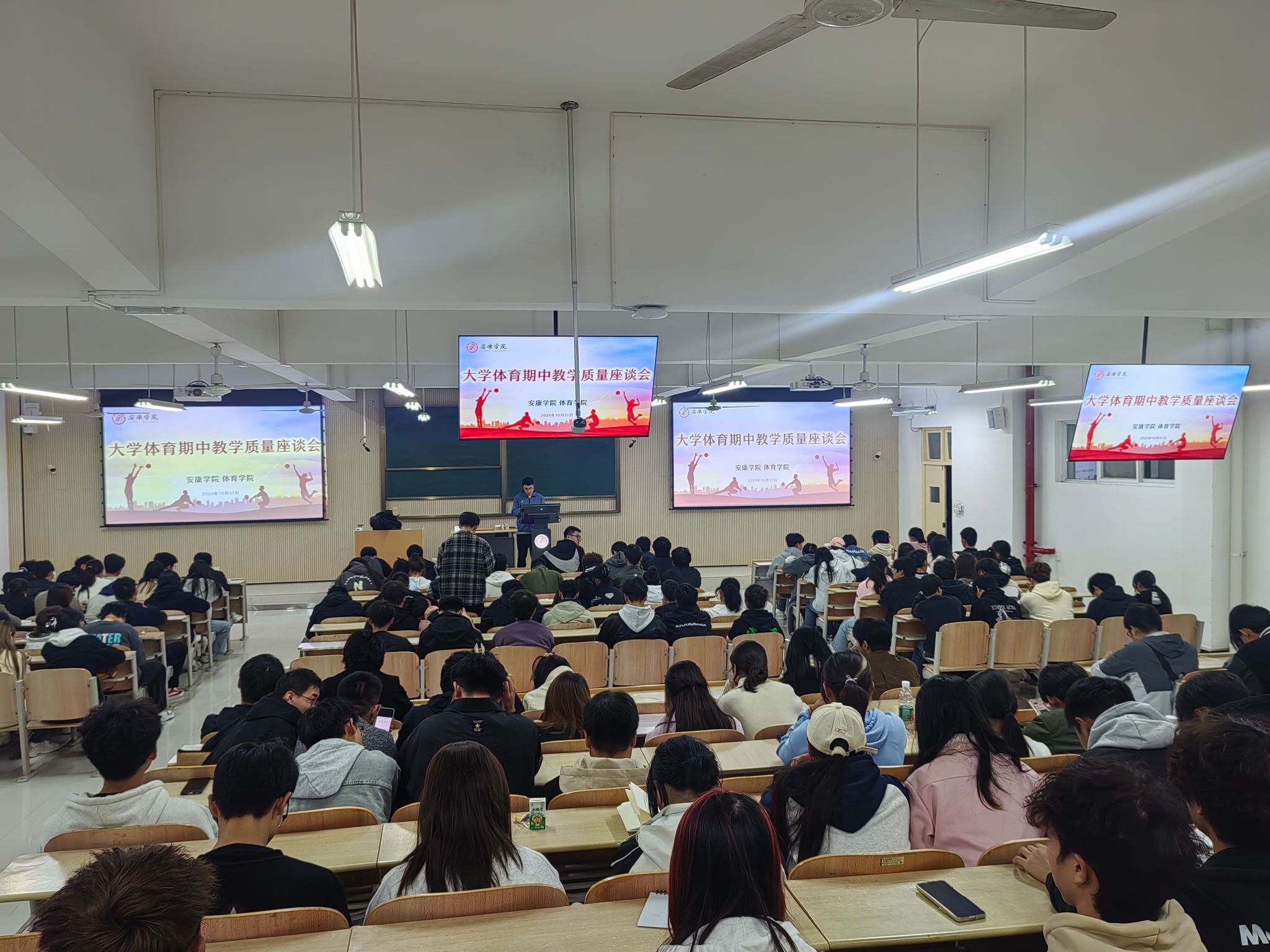 为进一步提高大学体育教学质量,全面掌握全校大学体育工作运行情况,帮助改进教学方法、提升学生学习效率,有序推进大学体育工作。2024年10月31日和11月1日,澳门正规电子游戏平台分别在江南、江北校区召开2024-2025学年第1学期大学体育期中教学质量座谈会,澳门正规电子游戏平台副院长李靖、澳门正规电子游戏平台教学办主任赵娇艳、大学体育教研室副主任王俊杰及各二级学院学生会体育部干部、2023级、2024级各班班长、体育委员等学生代表参加座谈会。会议由大学体育教研室副主任王俊杰主持。
