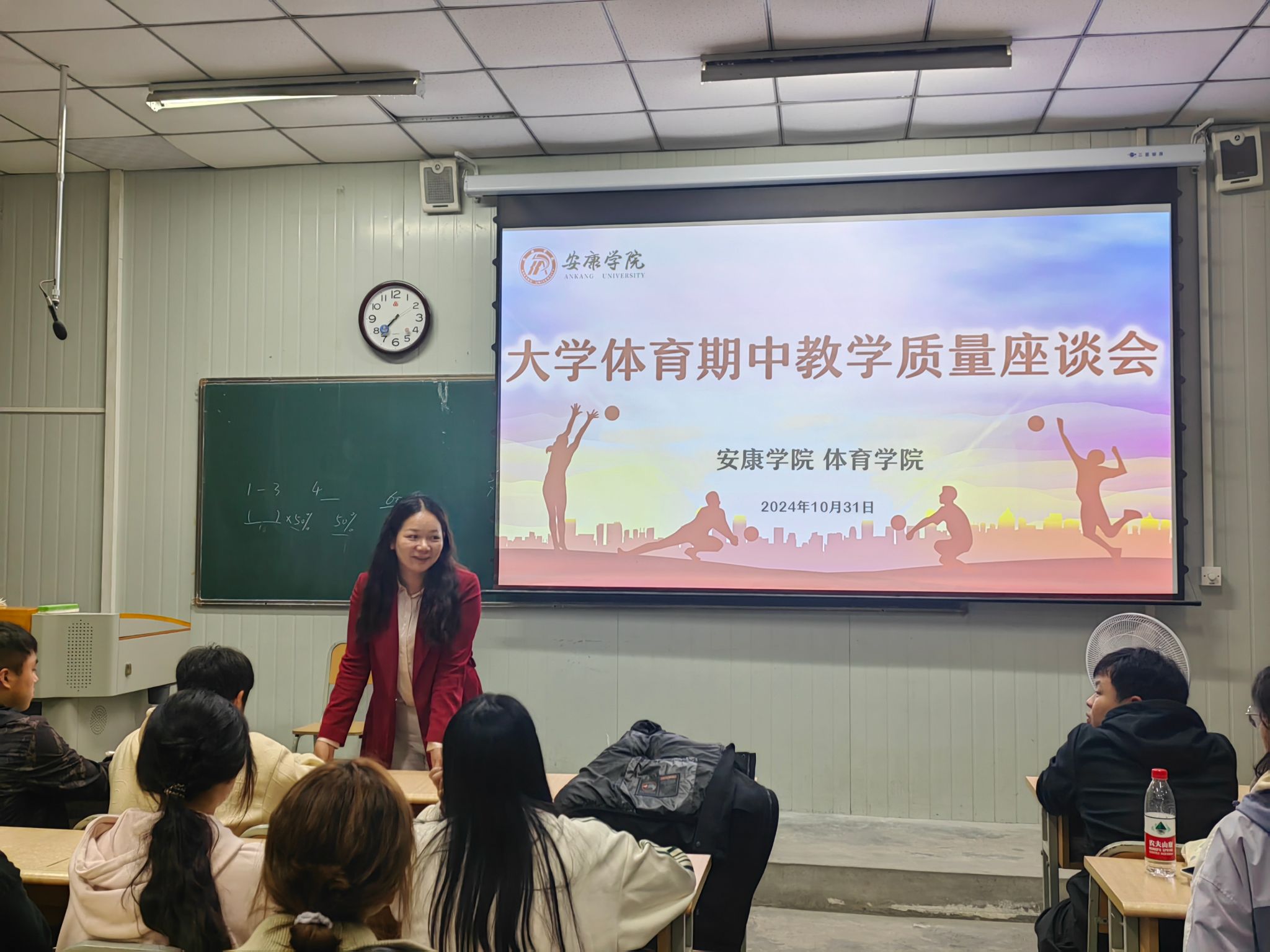 会议伊始,王俊杰从大学体育课程设置、课外跑、保健课申请、体质健康测试等四个方面分别做了介绍和说明,并强调体育干部要起到上传下达作用,将会议精神通过班会传达给每位同学。