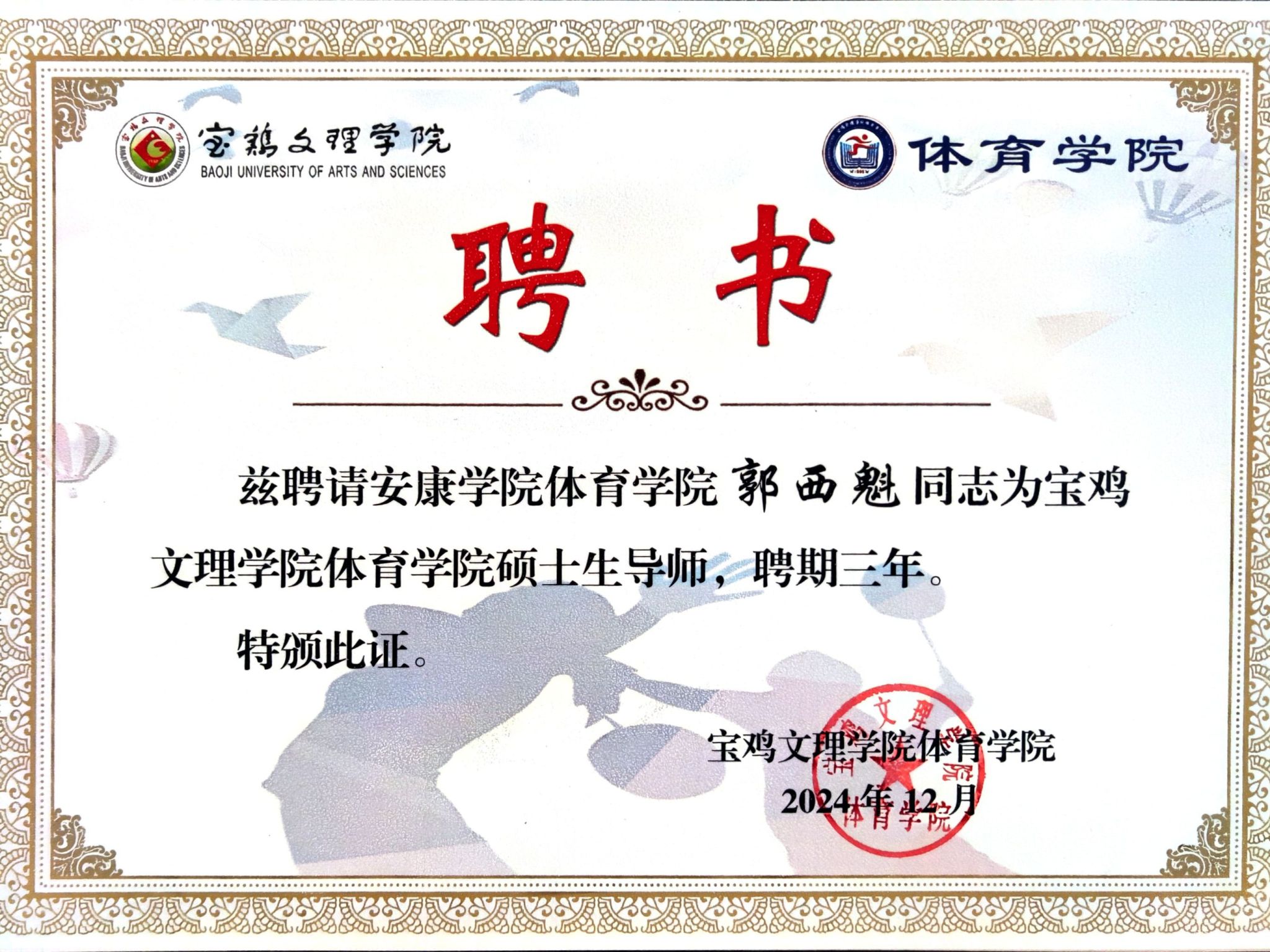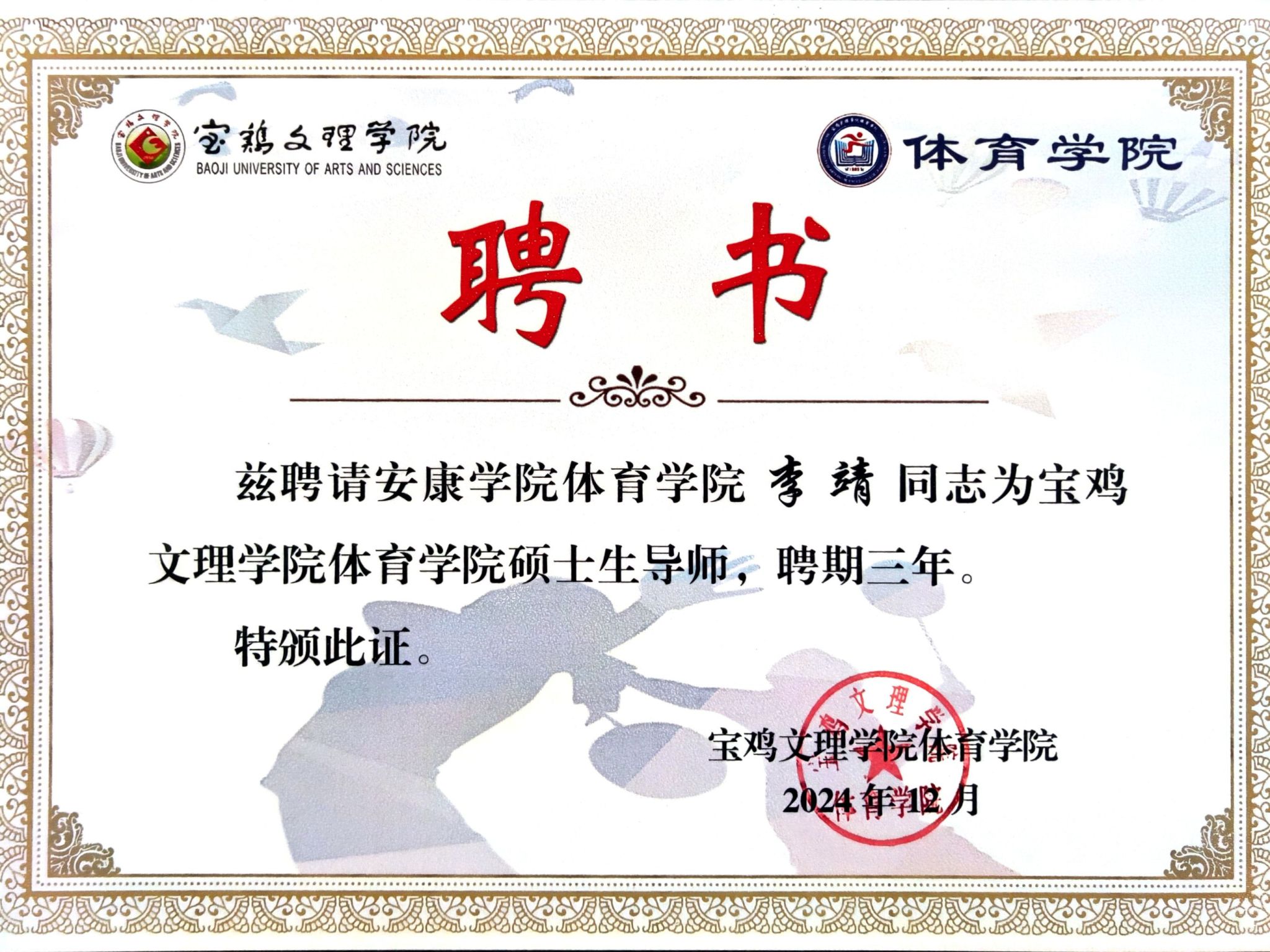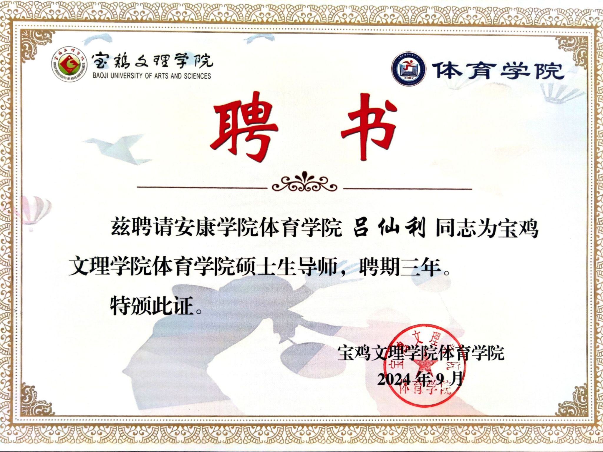 宝鸡文理学院澳门正规电子游戏平台严格按照专业硕士学位教育的要求,经过层层遴选,决定聘任我院吕仙利、郭西魁、李靖三位老师为宝鸡文理学院澳门正规电子游戏平台硕士专业学位研究生指导教师。本次聘任工作不仅是宝鸡文理学院澳门正规电子游戏平台对我院教学师资力量的肯定,同时也将为我院培养一批具有硕士研究生培养经验的人才,为进一步促进我院体育教学、科研工作水平的提高和申报专业硕士点奠定了重要基础。