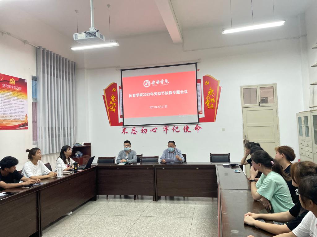 4月27日下午6点在体育馆1楼会议室召开澳门正规电子游戏平台2022年劳动节放假专题会。澳门正规电子游戏平台党总支书记高立平、学工办副主任王立、团总支书记康梦瑶、宿舍信息员参加了会议。会议由学工办副主任王立主持。