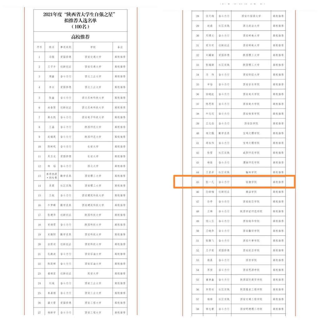 我院学生张一凡荣获2021年度“陕西省大学生自强之星”称号